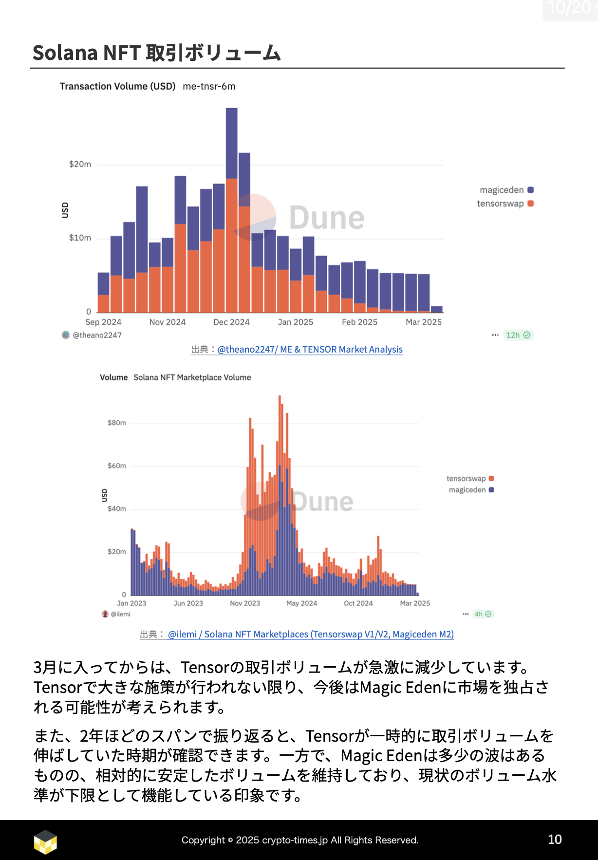 一方で、長期的な視点から見ると、Tensorは一時的にボリュームを伸ばした時期があったことも確認できます。しかし、Magic Edenは継続的に取引ボリュームを確保しており、これまでの実績を踏まえると、今後もSolana市場において大きなシェアを確保し続けることが予想されます。