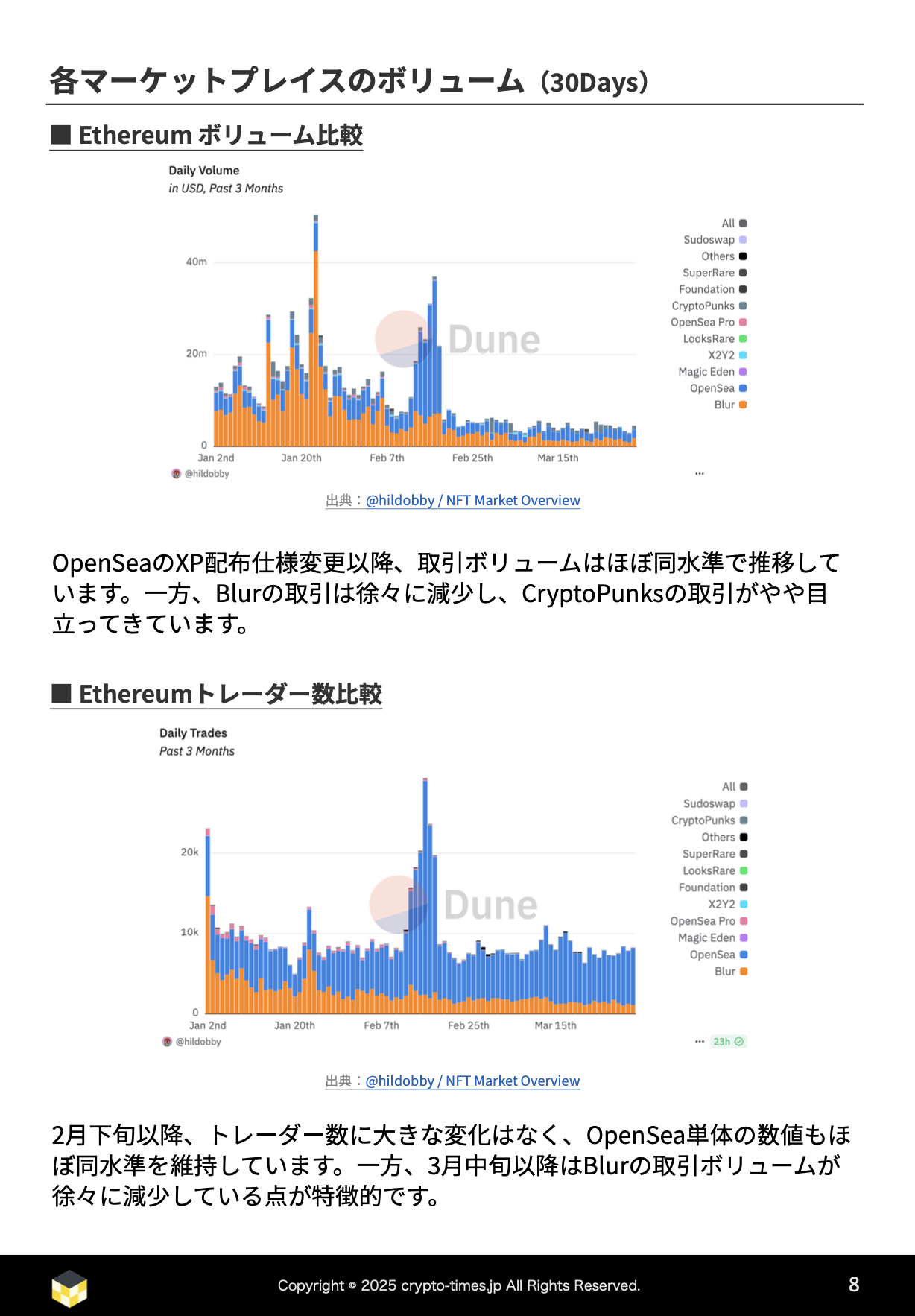 トレーダー数については、全体的に大きな変化はなく、Blurが徐々に減少していることが特徴的といえます。3月に入ってからは、Blurの取引ボリュームとトレーダー数のいずれもが減少している動向が表れています。